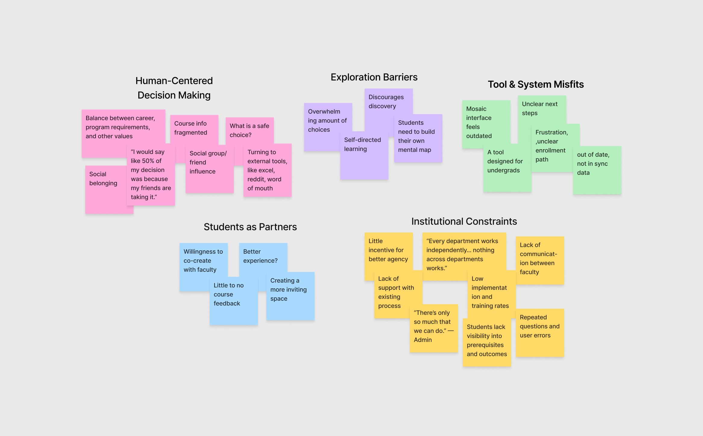 Course selection felt like “making bets on my future” (student). Mosaic forced students to scour scattered information across PDFs, emails, and Reddit threads, leaving students anxious, staff overwhelmed, and faculty mismatched with unprepared students.
